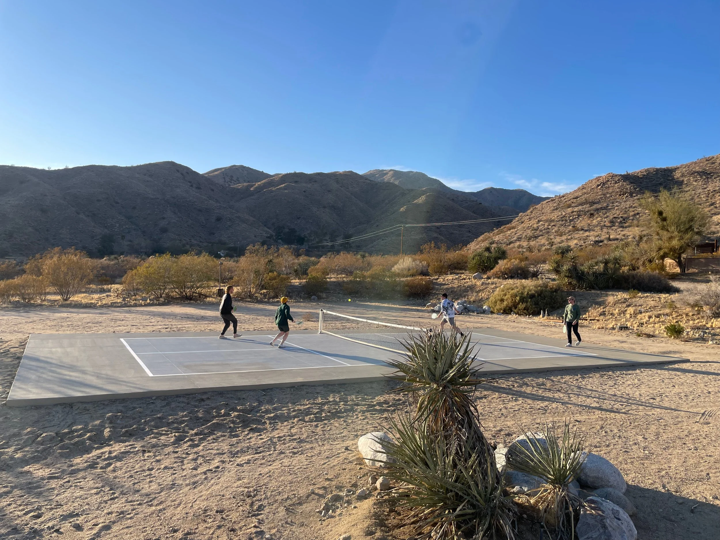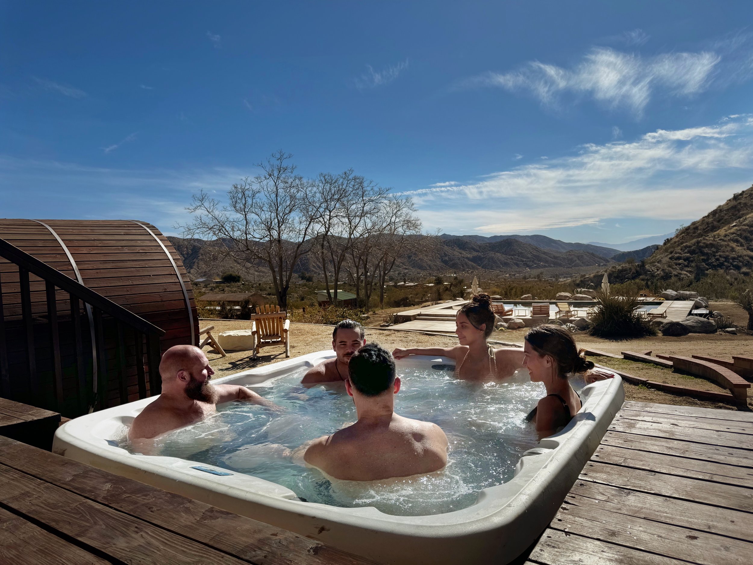 Embrace nature with nearby activities like horseback riding, climbing, bouldering, golfing, hikes, and tours to Joshua Tree National Park. Those who prefer staying onsite, can enjoy the serenity 360-degree mountain views, our barrel sauna, cold plunge, heated pool and spa, above ground jacuzzi, pickleball court, steam room shower, and our spacious indoor yoga room.